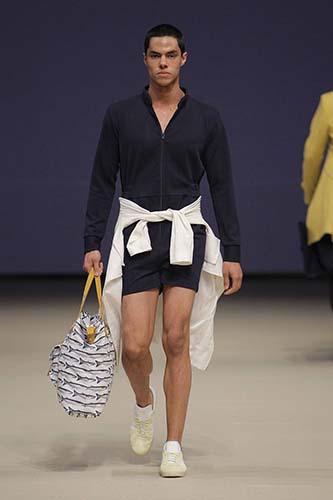 The collection also blends humor in its discourse through details such as the fish prints and engages the viewer in discussion by provoking thought through items whose inspiration or goal is not clear, therefore leaving the viewer and, why not, the wearer to give his own meaning to the clothes.