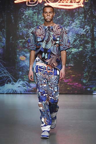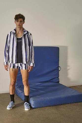 Boyish and fun, this outfit is definitely something many guys in their late 20s and 30s would love to wear. The fitting short shorts are a rarity on today’s runways, which is why they are so welcome. Also, the prints consisting of different shades of blue makes the whole look sophisticated, mature and elegant. The outfit is fresh and summery and can make for a great summer’s day look.