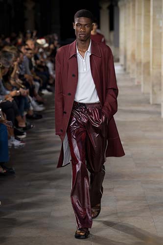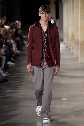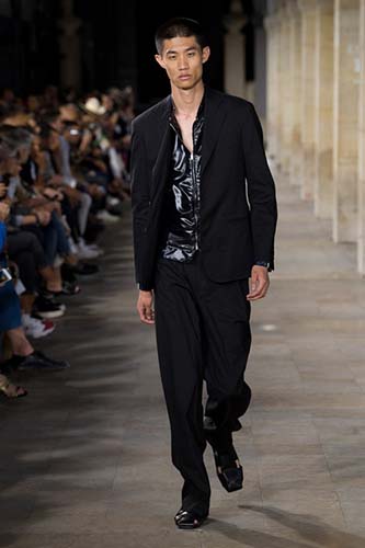 The collection, consisting of many sporty clothes, but also of more elegant items including a black chiffon crocodile jacket, is very young, but can be worn by men of all ages, which is a rare talent that Nichanian obviously possesses. Some of the pieces of the collection were made from a patented fabric called Toilbright, which has the glossy sheen of a foil candy wrapper. This gave a very interesting effect to the clothes in the bright light of the runway.