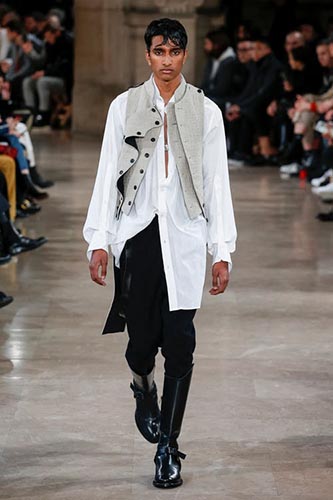 This look from the latest Ann Demeulemeester collection grabbed our attention as it featured an interesting interplay between a half-double vest balanced out by an open white shirt. It’s a new spin on classic clothes, which is what innovative fashions are all about.