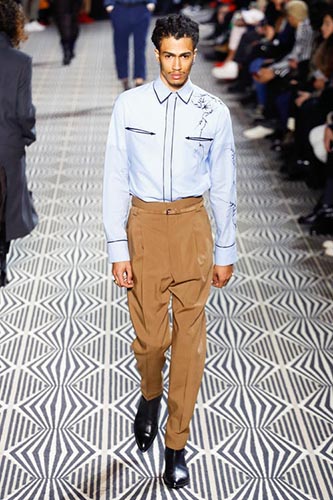 This look from the Haider Ackermann collection was sleek and dynamic, but also had an underlining soft charm to it, which made it truly great. We love the pairing of the neutral pants with the soft blue shirt which features some great dark accents. It is a relaxed and laid back look, but it is studied and carefully crafted, which is what makes it really special.