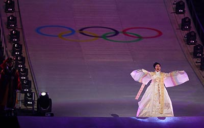 From our point of view, the fashion gold medal goes to Korean opera singer Hwang Su-mi, who performed the Olympic anthem. Her look was memorable and truly impressive; we enjoyed the mix of old and new and the simplicity of the outfit’s opulence.