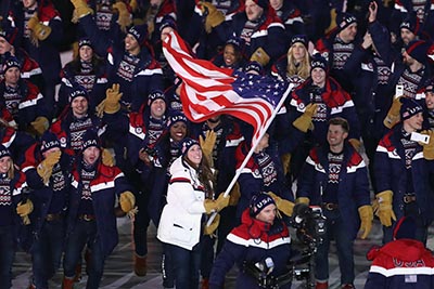 During the Parade of Nations, besides the Tongan man and the shorts worn by the Bermuda delegation despite the cold outside, there were not very many incredible style moments. And the reason is a good one: the low temperatures make it hard to wear incredibly stylish clothes and so, most delegations wore warm winter clothes in the colors of their flag or resembling their flag, sometimes accessorized with hats or featuring certain traditional details such as prints or patterns. The US delegation was fashion-forward and culture-forward with their battery-powered heated jackets. These were made by made by Ralph Lauren and featured a rechargeable battery pack in the pocket that heats up conductive ink printed on the jacket to keep the athletes warm. The gloves were a little odd though.