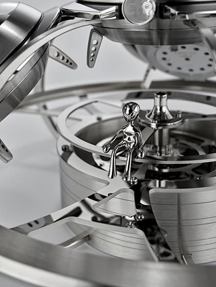 And, to top it all off, a very literal approach to space fantasy is the Fifth Element by MB&F and L’Epée 1839. This item is an intergalactic horological weather station that enables accurate weather forecasting even when the power goes down. It features four (UFO) elements: clock, barometer, hygrometer, and thermometer combine in a mother ship (with Ross, the alien pilot). It really is a remarkable piece that is both mysterious and an open door to a fictional world, where the stories are endless.