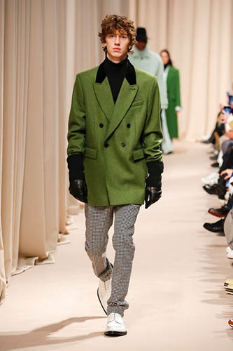 A rich and deep color mixed with a classic pattern usually results in a very upscale mix. This Ami look goes to show that and is a great lesson in style. We would have liked for the jacket to be a bit more fitted, but for a runway show, we can accept it, as it makes a good visual impact.