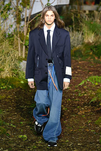 This Off-White look is uncommon and a bit odd, but it works in a rather strange way, which is why we like it. These days, there’s a lot of oversized, hyperbolic clothes on the runways of the world, which makes the concept rather boring, but we did like this look because it has an interesting play with proportions (the weight is naturally in the lower half, making it look like a structure) and because it is a high-and-low mix that actually works.