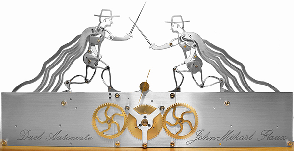 Being on his own, John-Mikaël turned to his first passion – mechanics and set aside classic watches in exchange for complex clocks and mechanical devices based on watch mechanisms. His impressive pieces, such as the Car Clock inspired many others to do similar things and the recent Time Fury P18 also made waves among connoisseurs. His creations have very often as a theme of inspiration the world of classic cars and, more broadly speaking, the world of intricate interactions and fine movements – as his Duel goes to show, a piece depicting a fight between two mechanical fencers. John likes mechanics so much, that he even drives a vintage Beetle, which is more fun for him than a new car would be.