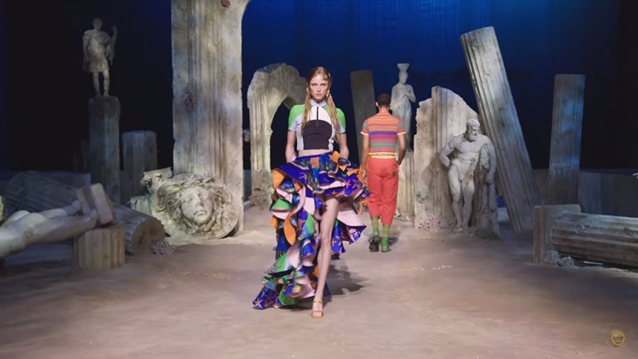 At Versace, it was an underwater aesthetic that dominated, with aquatic prints, wet styling and an overall under-the-sea set.