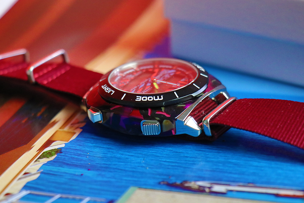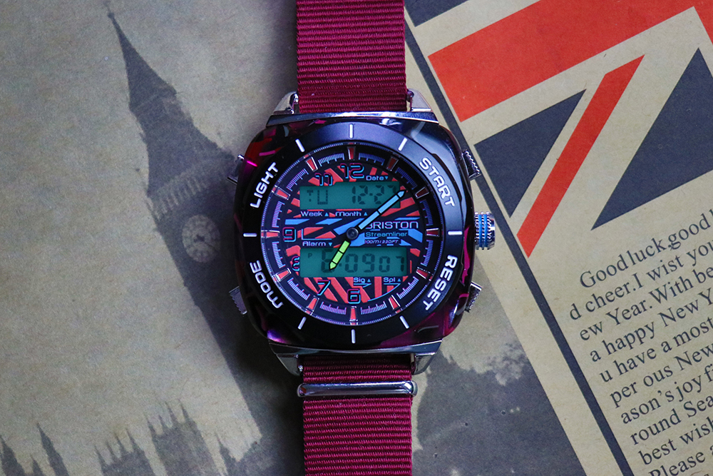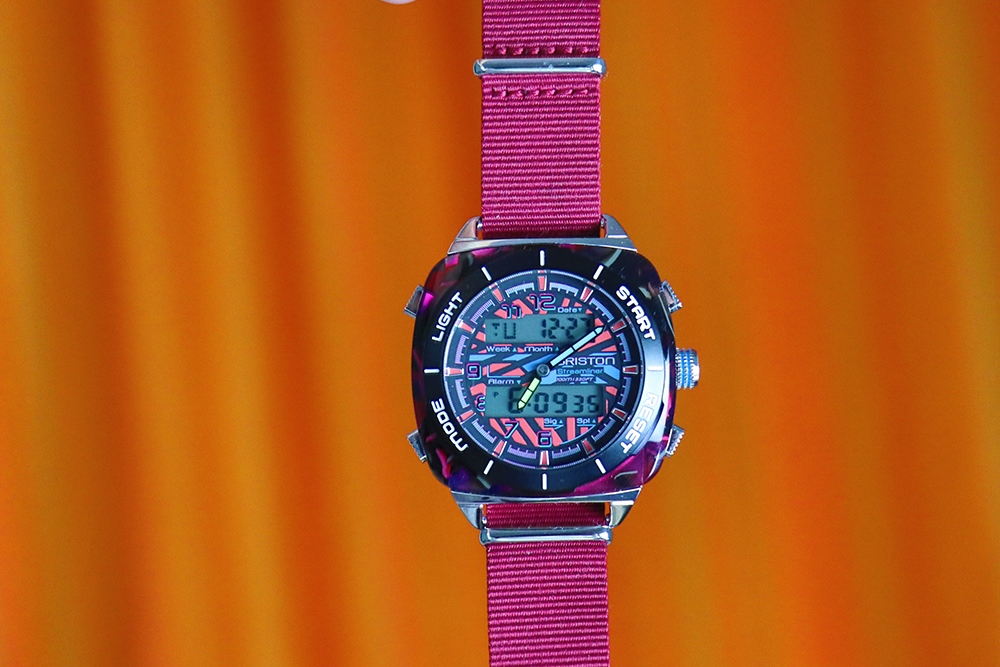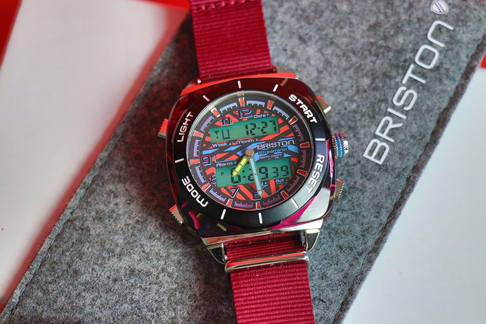 For the first time, a shock-resistant watch with a cambered tonneau form from the Streamliner series is outfitted with both an analog movement (Quartz Miyota 203A) and a digital movement. Additionally, it has a 44 mm case constructed of incredibly durable burgundy swing cellulose acetate. The casing looks really beautiful and catches the light in a way that is quite astounding – definitely a conversation starter!