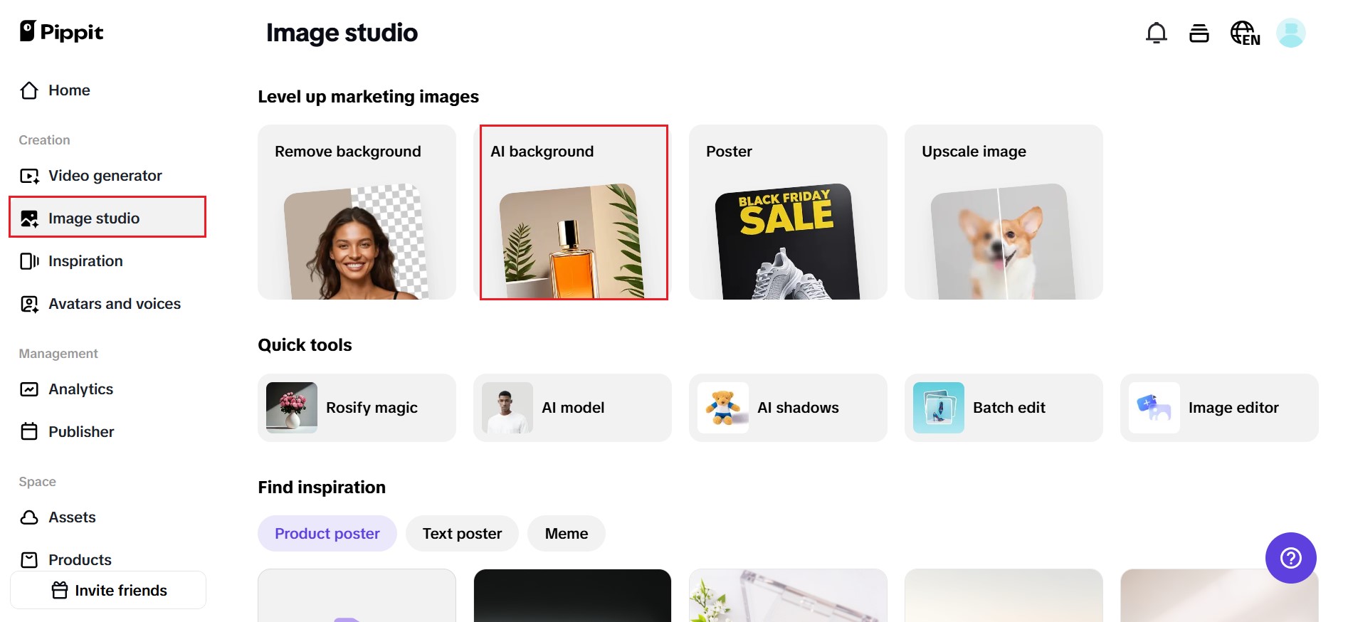Sign up for Pippit AI generator background, then open ‘Image Studio‘ in the left sidebar. Click on ‘AI Background‘ under Quick Tools. Drag and drop the photos you want to update — maybe your YouTube profile image, Instagram highlight covers, and Facebook cover all in one go — or click ‘Device‘ to import them from your computer.