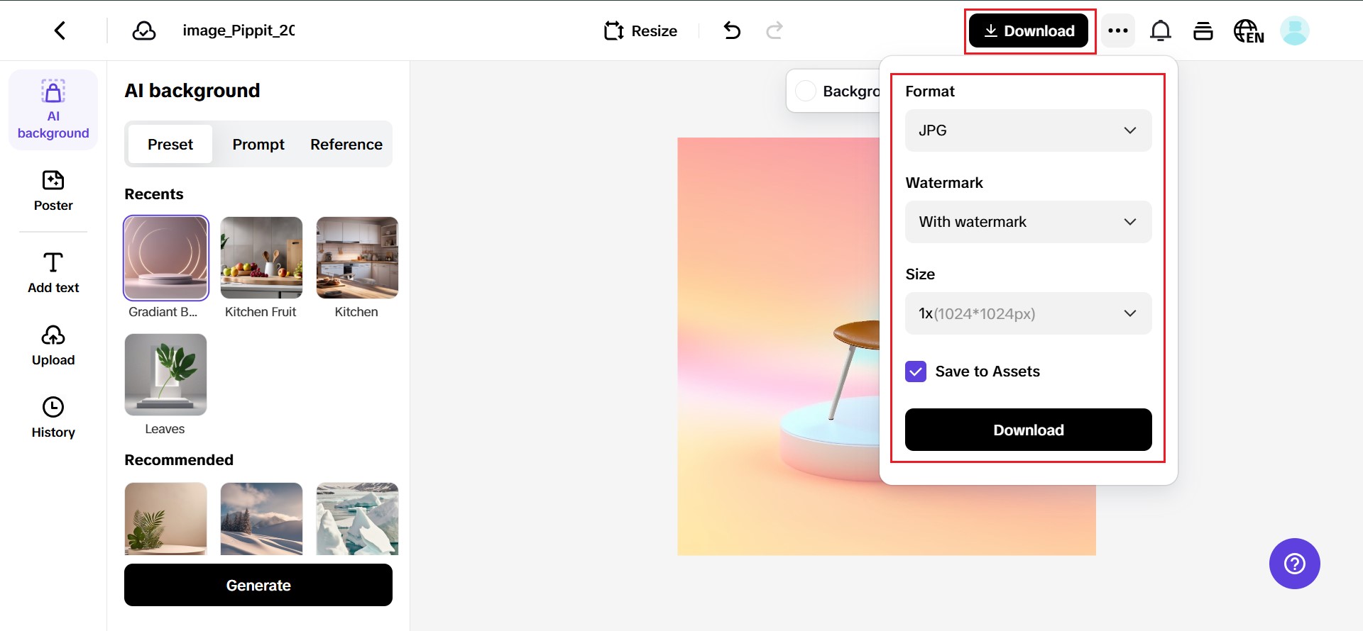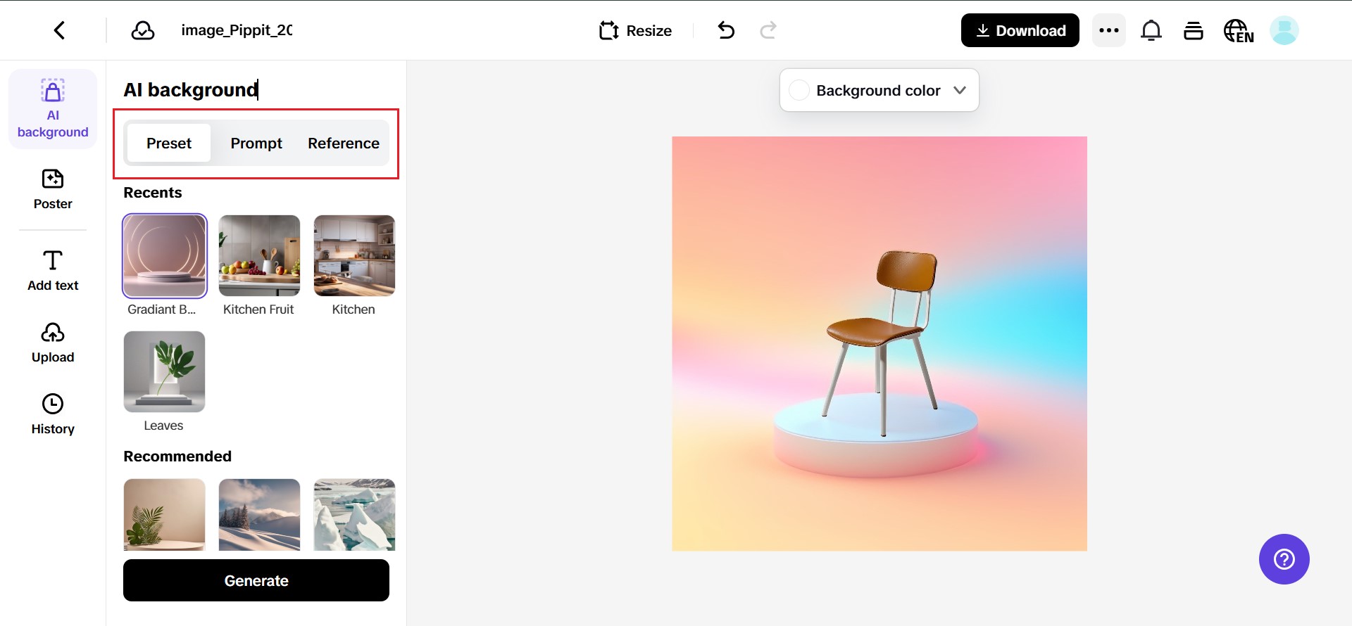 Tap ‘Preset‘ to choose a pre-made branded backdrop, ‘Reference‘ to upload your own mood board, or ‘Prompt‘ to generate a custom scene using AI. Watch as the AI tool does its magic and removes your old background.