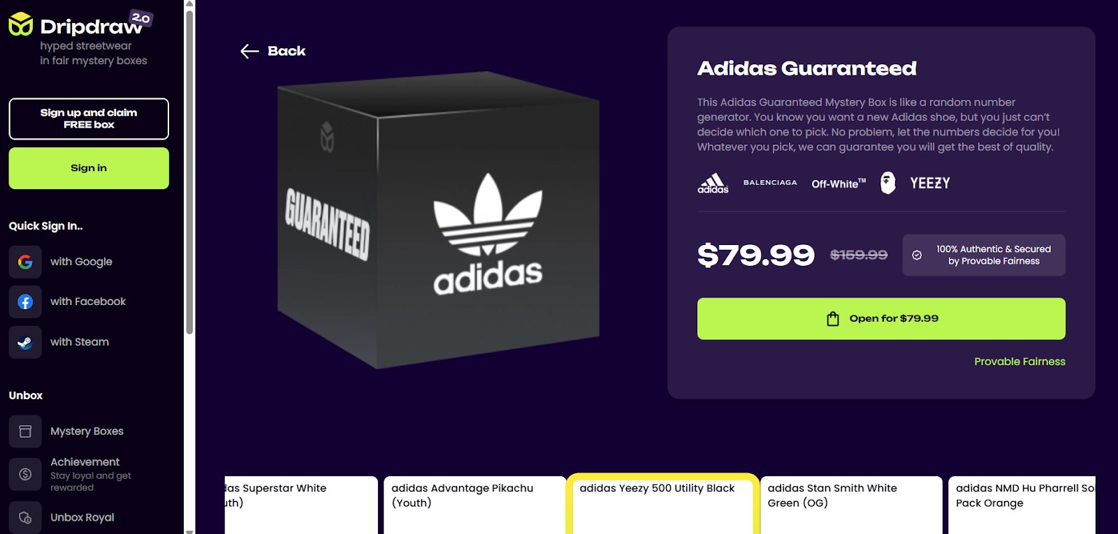 - DripDraw: Adidas-focused boxes with guaranteed authentic items