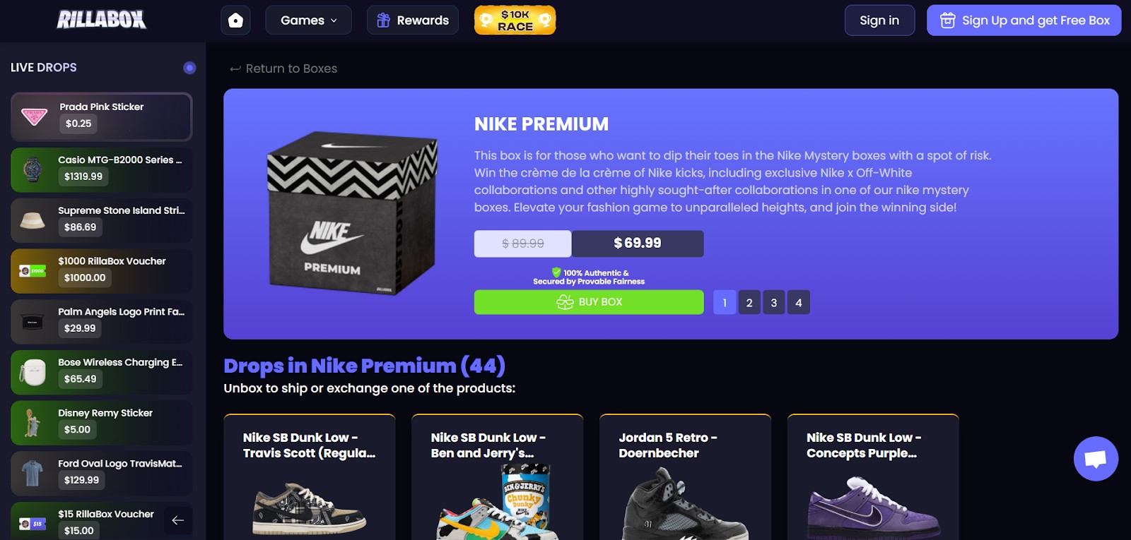 RillaBox’s $70 Nike Premium box aims to impress with one of the most ambitious sneaker lineups available. With top prizes like the Nike SB Dunk Low Travis Scott and the Ben & Jerry’s Chunky Dunky, it appeals to anyone searching for rare, high-profile collaborations that typically vanish from retail shelves.