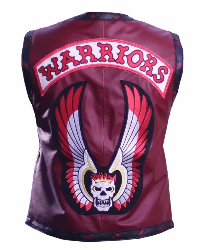 The vest is all attitude, deep maroon faux leather, sleeveless, raw edges, and means I don’t play by your rules. The giant flaming skull-and-wings patch with the word “Warriors” boldly stated on the back is the overall statement. You are not going to blend in with this one. Add a bandana and boots, and you’re good to go with your menacing glare.